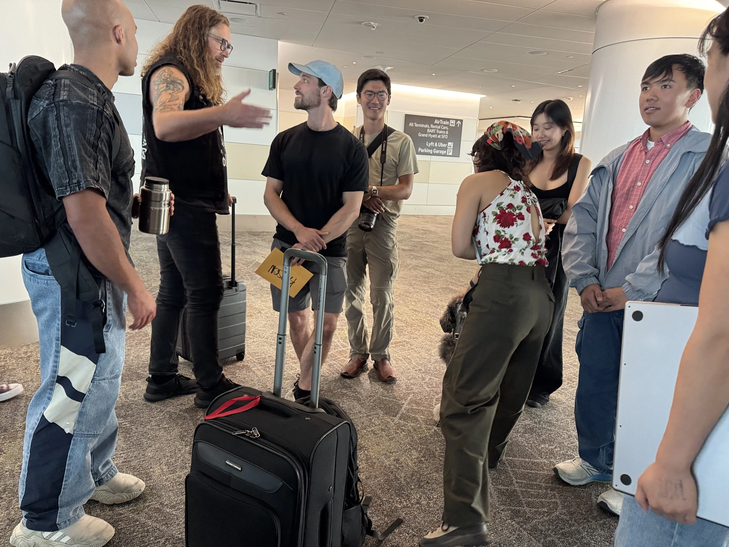I co-created an event with Tucker Bryant at SFO where 20 strangers showed up with a carry-on and one person would be sent on a completely surprise trip, designed that day. First, we took people on a 1-hour adventure outside security—including visiting Vito Acconci’s telephone hallway, playing sardines at baggage claim, and watching a short film in the International terminal’s theater. Then we picked one person at random and flew them to a surprise destination chosen by everyone else. The rest of the group became the travel agents. We gathered in the airport lounge, opened a shared Google spreadsheet of departing flights, checked the winner's social media for vibes, split into groups to brainstorm domestic and international options, and voted on a destination. We sent our winner to Manila for 3 days.